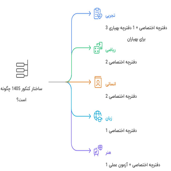 تعداد سؤالات کنکور سراسری 1405 با حذف دروس عمومی در سالهای اخیر، تنها شامل سؤالات اختصاصی است که در قالب دفترچههای جداگانه برای هر رشته ارائه میشود. در رشته تجربی، 170 سؤال در 3 دفترچه (به علاوه دفترچه بهیاری برای داوطلبان مربوطه) با زمان 180 دقیقه، در ریاضی 105 سؤال در 2 دفترچه با 145 دقیقه، در انسانی 160 سؤال در 2 دفترچه با 160 دقیقه، در هنر 100 سؤال در 1 دفترچه با 115 دقیقه و در زبان 70 سؤال در 1 دفترچه با 105 دقیقه طراحی شده است. تعداد سؤالات هر درس و زمان پاسخگویی به آنها برای برنامهریزی دقیق داوطلبان اهمیت دارد. رشته هنر علاوه بر آزمون کتبی، آزمون عملی نیز دارد. برای رشته زبان، داوطلبان باید زبان خارجی موردنظر خود را هنگام ثبتنام انتخاب کنند. برای آشنایی با منابع درسی هر رشته و کتابهای معرفیشده توسط سازمان سنجش، میتوانید به صفحه منابع کنکور 1405 سازمان سنجش + لیست منابع درسی 1405 مراجعه نمایید.